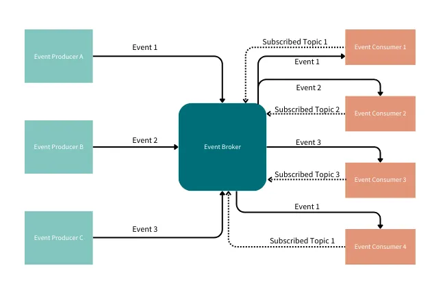 Der Event Broker ist eine zentrale Komponente des Event-Driven-Systems. Er empfängt die Ereignisse vom Event Producer und leitet sie an die entsprechenden Event Consumer weiter. Der Event Broker stellt sicher, dass die Ereignisse zuverlässig und effizient zwischen den Komponenten kommuniziert werden.