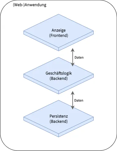 Eine (Web-)Anwendung lässt sich grundsätzlich in drei Schichten aufteilen. Neuere Ansätze wie Serverless Computing lassen die Grenzen zwischen diesen Schichten allmählich verschwimmen. Nichtsdestotrotz lohnt sich die Betrachtung dieser Schichten zur Einordnung die Beispiele weiter unten. Hierbei handelt es sich um die Anzeige in der obersten Schicht, die Geschäftslogik in der mittleren Schicht und der Persistenz in der untersten Schicht. Die Abbildung verdeutlicht die drei Schichten.