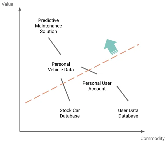 Im Prozess, in dem wir Software(-architektur) entwerfen, halten wir uns dieses Modell vor Augen. Das Ziel dabei ist es nur Komponenten individuell zu entwickeln, die neuartig (weit links) sind und einen hohen Kundennutzen (weit oben) haben. Das anlegen einer solchen Map hilft dabei zu erkennen, worauf wir uns bei der Softwareentwicklung fokussieren sollten und damit das bereits oben erläuterte Phänomen des DIY zu vermeiden. Wir sehen hier eine Wardley Map für verschiedene Software-Komponenten, die eine Wartungsvorhersage für das private KFZ ermöglichen.