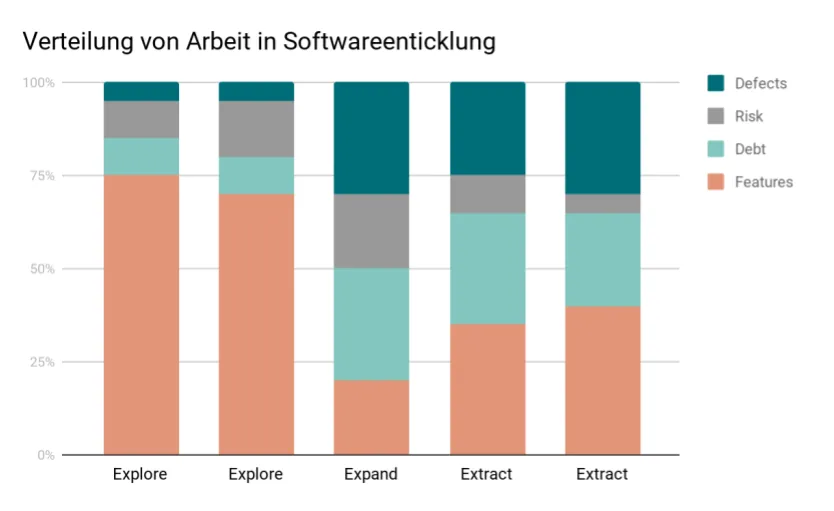 Das Schaubild zeigt eine exemplarische Verteilung, die sich auch gut auf die drei Phasen des 3X-Modells beziehen lässt. In der Explore-Phase ist es durchaus sinnvoll viel Kapazität in Features zu investieren. Wir müssen aber dafür in der Expand- und Extract-Phase Debt abbauen und eventuell Risiken mitigieren. Ein weiterer Aspekt, der oft unterschätzt wird ist, dass viele Defects erst aufgedeckt werden, sobald man in die Expand-Phase übergeht. Die Begründung haben wir bereits in dem Abschnitt zum komplexen Problem gesehen. Man muss also damit rechnen, dass nach einem Release, die Anzahl der umgesetzten Features zu Gunsten von Defects sinkt.
