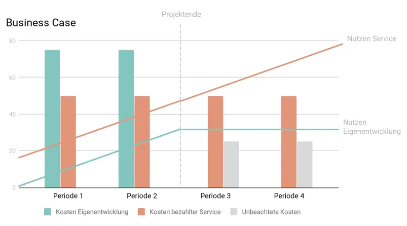 Wir sehen hier einen Business Case mit vier Perioden. Die Summe der Kosten für den bezahlten Service übersteigt die Summe der Kosten für die Eigenentwicklung. Was allerdings allzu gern außer Acht gelassen wird sind unbeachtete Kosten. Das umfasst zum Beispiel den Betrieb, die Wartung, Bugfixes und den Support der Eigenentwicklung. Diese Kosten setzen sich über die betrachteten Perioden des Business Cases hinaus fort. Das ist ebenso der Fall für die kontinuierlichen Kosten eines bezahlten Services. Was jedoch noch verschärfend hinzukommt ist, dass die Lücke zwischen dem Nutzen des Services und der Eigenentwicklung stetig größer wird.