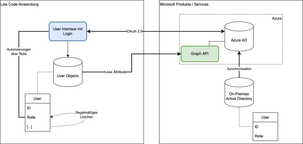 In der Regel bieten Low Code-Anwendungen eine vorgefertigte Funktionalität, um Logins über einen OAuth 2.0 Flow anzubieten. Während des ersten Logins eines User über diesen Flow wird ein neuer User in der Low Code-Anwendung angelegt. Im User-Objekt der Low Code-Anwendung wird eine ID oder Email-Adresse gespeichert, welche den User mit dem entsprechenden Azure AD-User verknüpft.
