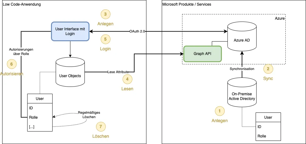 In der Regel bieten Low Code-Anwendungen eine vorgefertigte Funktionalität, um Logins über einen OAuth 2.0 Flow anzubieten. Während des ersten Logins eines User über diesen Flow wird ein neuer User in der Low Code-Anwendung angelegt. Im User-Objekt der Low Code-Anwendung wird eine ID oder Email-Adresse gespeichert, welche den User mit dem entsprechenden Azure AD-User verknüpft.